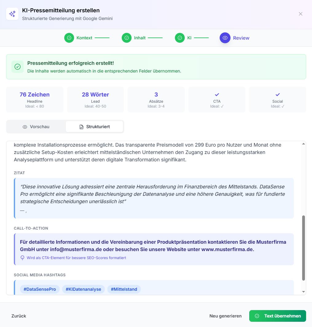 - Verwandeln Sie lose Stichpunkte in Sekundenschnelle in eine vollständige Pressemitteilung und erzielen Sie als Einsteiger sofort professionelle Ergebnisse.